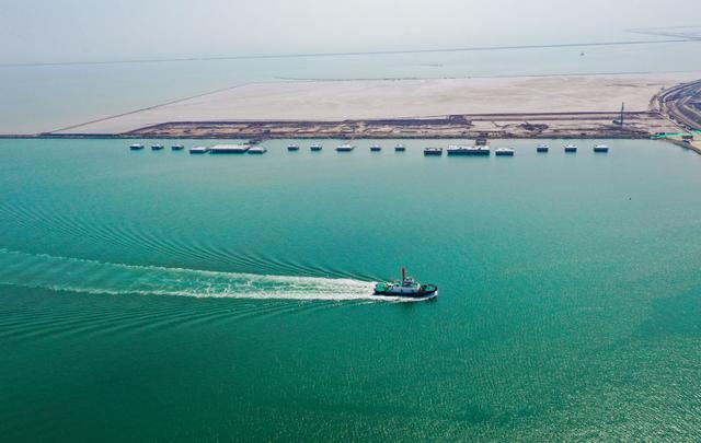 ↑9月17日拍摄的山东东营港经济开发区油品化工泊位项目(无人机照片)。