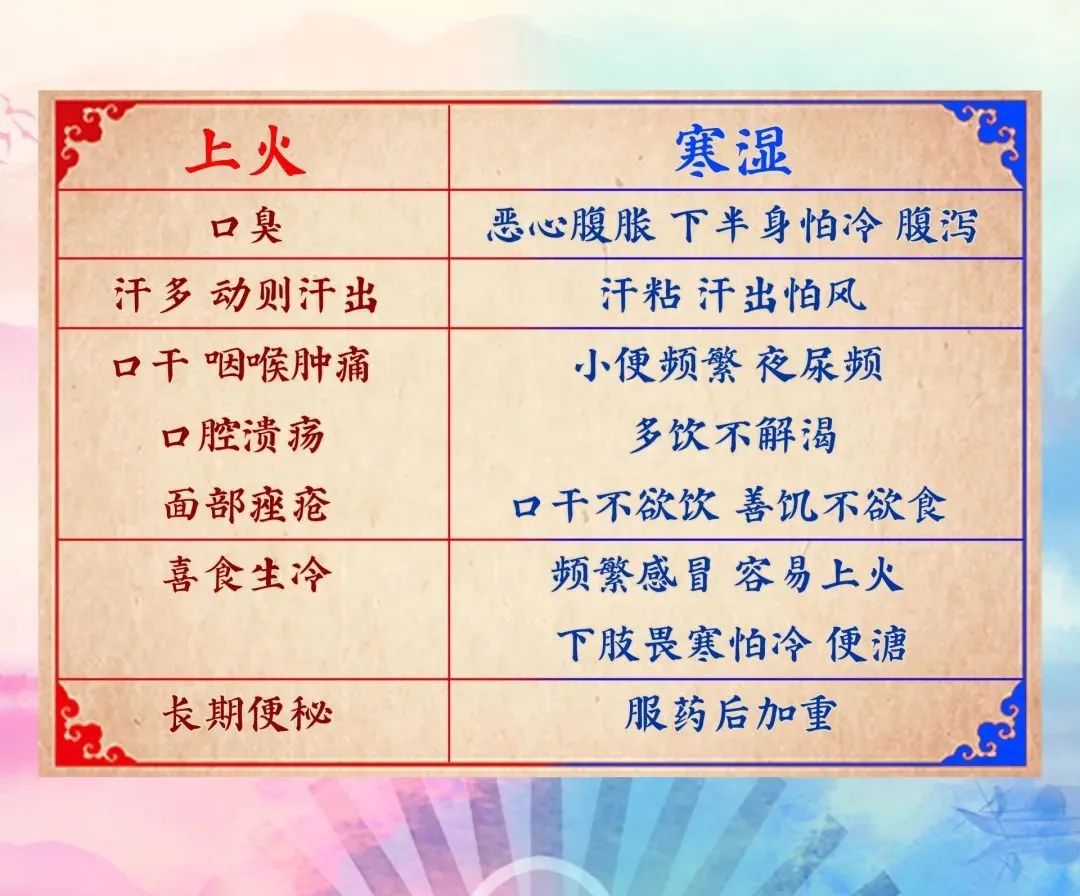 熊主任告诉我们,肿瘤的“易感体质”就是寒湿体质。寒湿内聚,虽然只是癌症形成的因素之一,但是却可能改变机体的免疫内环境,形成肿瘤出现、生长与转移的肿瘤微环境。寒湿体质的内环境一旦形成,会贯穿癌症发展的始终,需要引起患者足够的重视。熊主任强调,体内有寒湿并不等于就是寒湿体质,但是体内出现寒湿的时候,就应该尽早祛除,避免发展成为寒湿体质。而体内有寒湿的人群身上,甚至会出现一些看上去像是上火的症状,到底应该如何分辨呢?