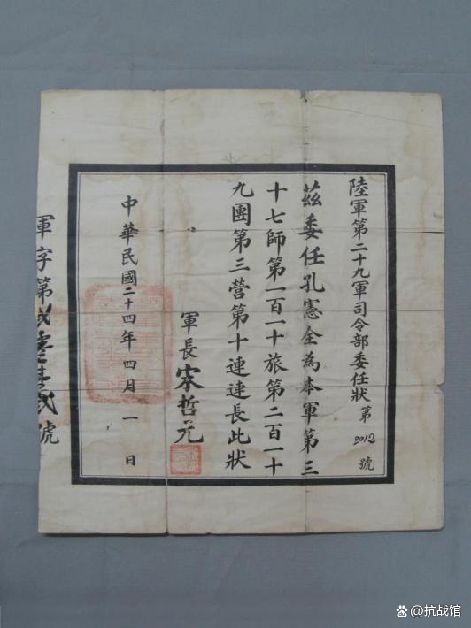 卢沟桥战斗中牺牲的第29军第219团第3营第10连连长孔宪全的委任状