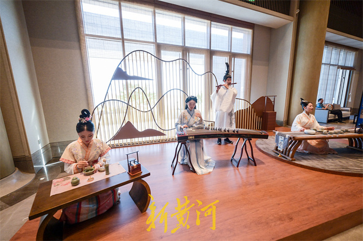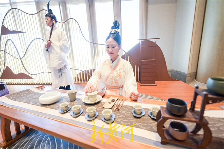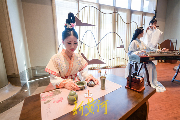 9月23日,在尼山圣境的尼山讲堂,现场搭建了仿古式小型舞台,摆放了棋台、古筝、茶桌和书桌等,身穿汉服的演员们现场合奏古乐,展示茶艺和香道,在悠悠的古乐声中,带观者穿越千年,追忆先贤圣哲,感受一代圣人的哲思与儒雅风。