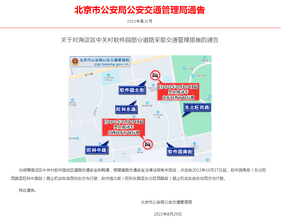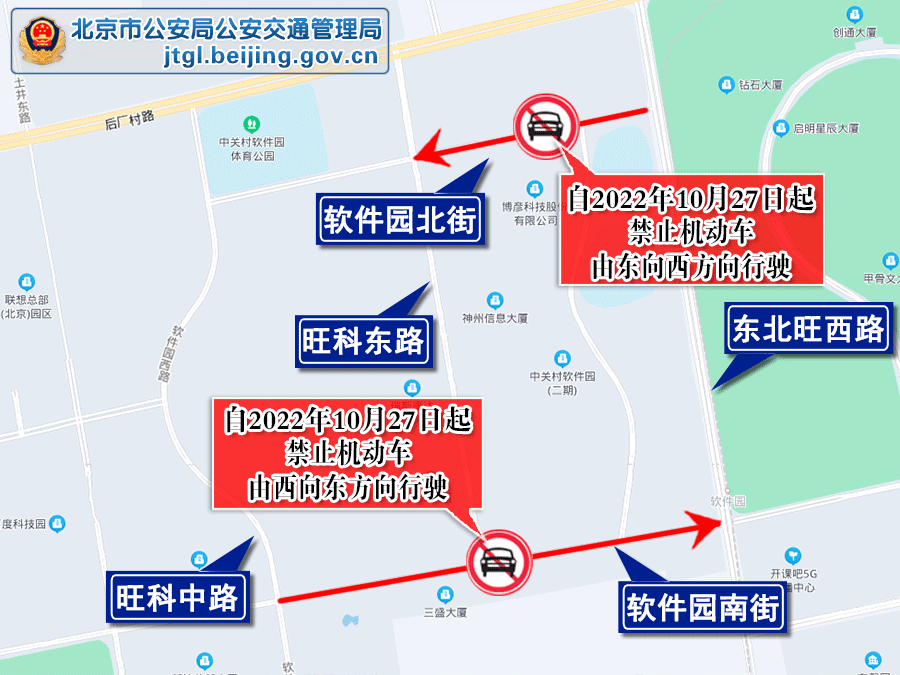 为保障海淀区中关村软件园地区道路交通安全和畅通,根据道路交通安全法律法规有关规定,决定自2022年10月27日起,软件园南街(东北旺西路至旺科中路段)禁止机动车由西向东方向行驶,软件园北街(旺科东路至东北旺西路段)禁止机动车由东向西方向行驶。
