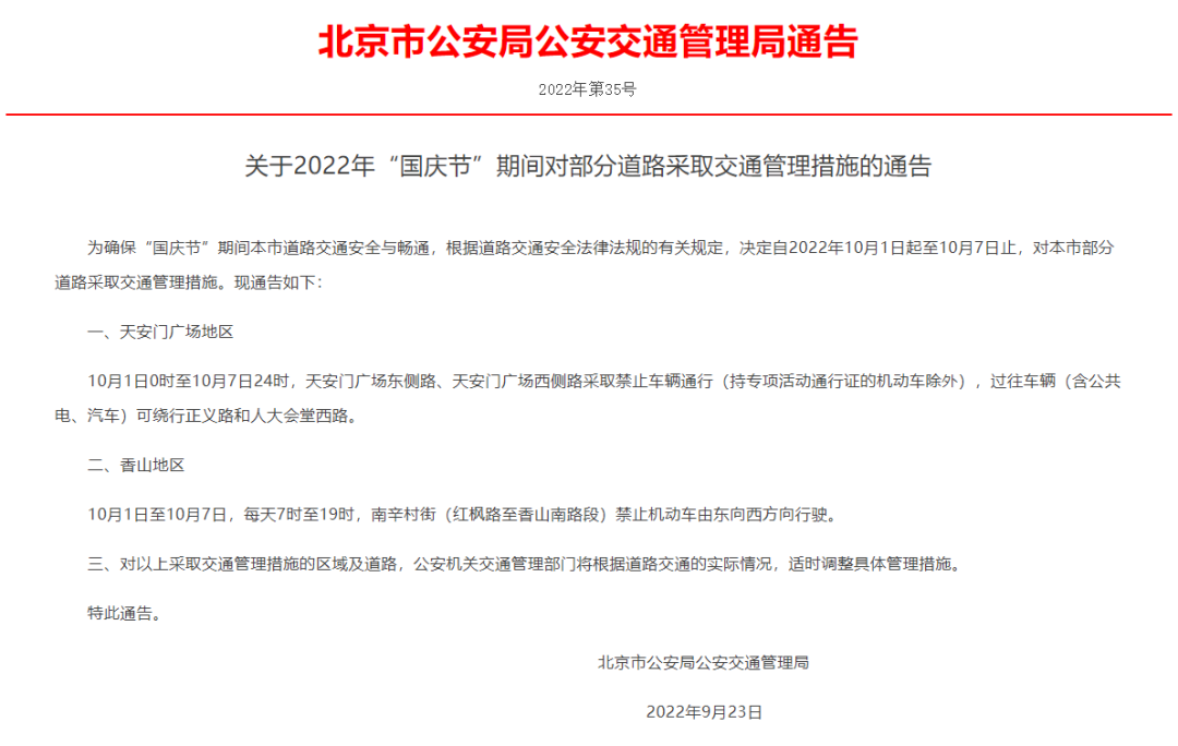 近日,北京市公安局公安交通管理局连续发布道路通行调整通告,在国庆假期期间以及节后上班,前往或途经海淀这些路段,请提前了解交通变化,遵守道路指示,注意交通安全。