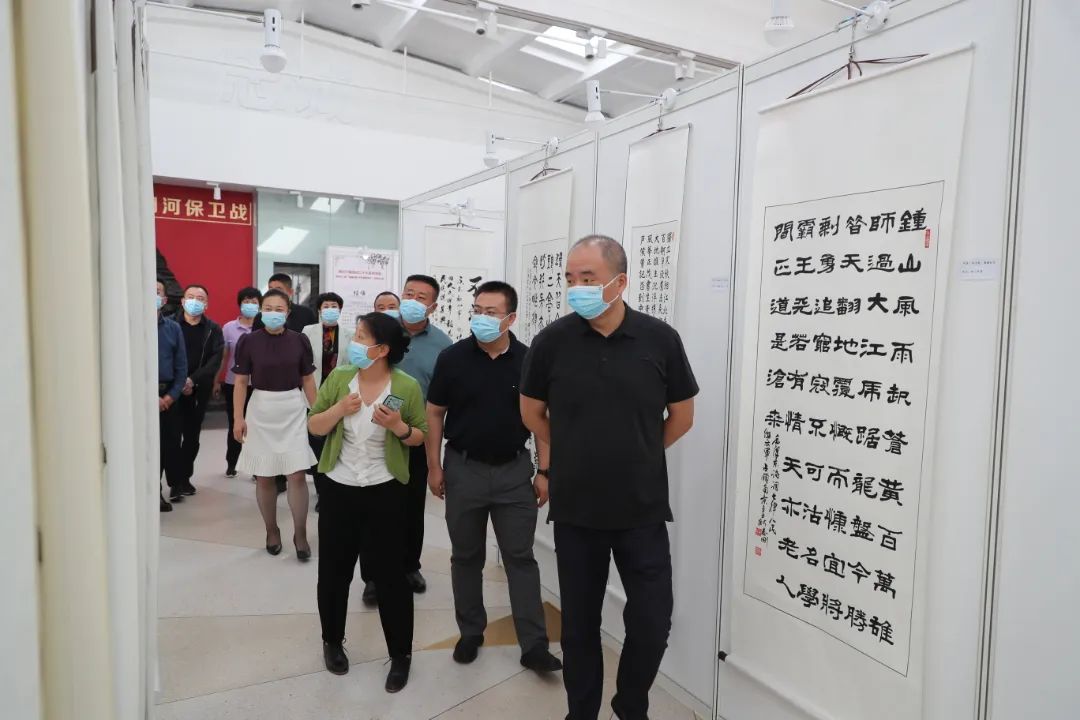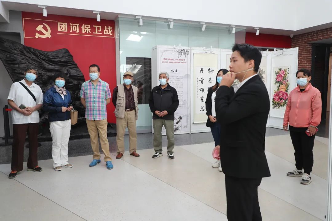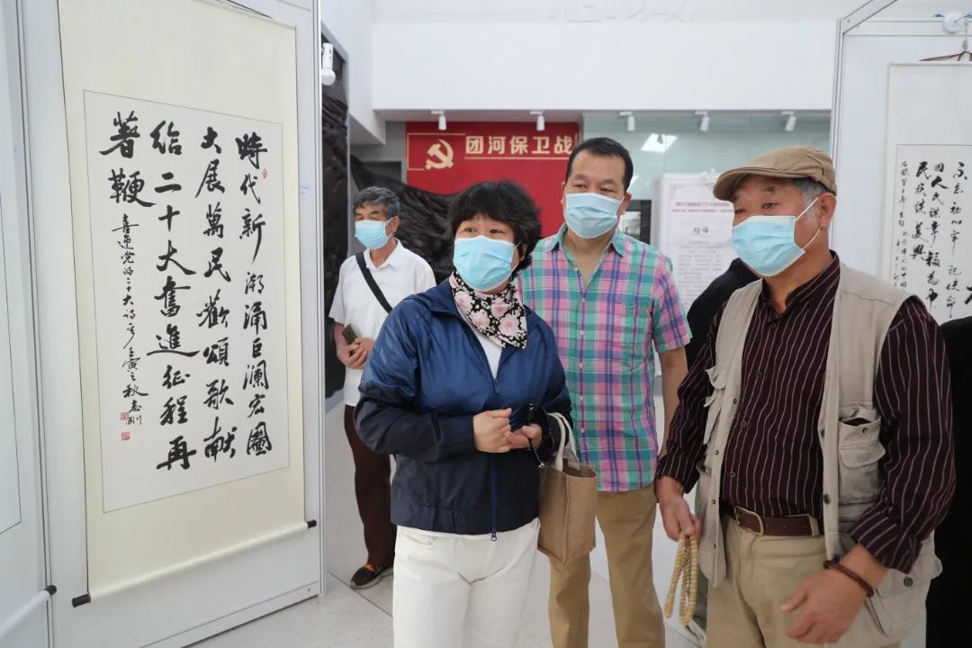 活动现场,解说员认真讲解,并与参展人员相互交流,欣赏作品的精美。篆隶浑然一体,楷书清秀隽永,行草挥洒自如,国画笔酣墨饱,抄录的毛主席诗词、二十大祝福语等内容,让参展人员进一步感受到艺术画作背后的家国情怀与精神血脉,进而激发心中爱党爱国的浓烈热情。