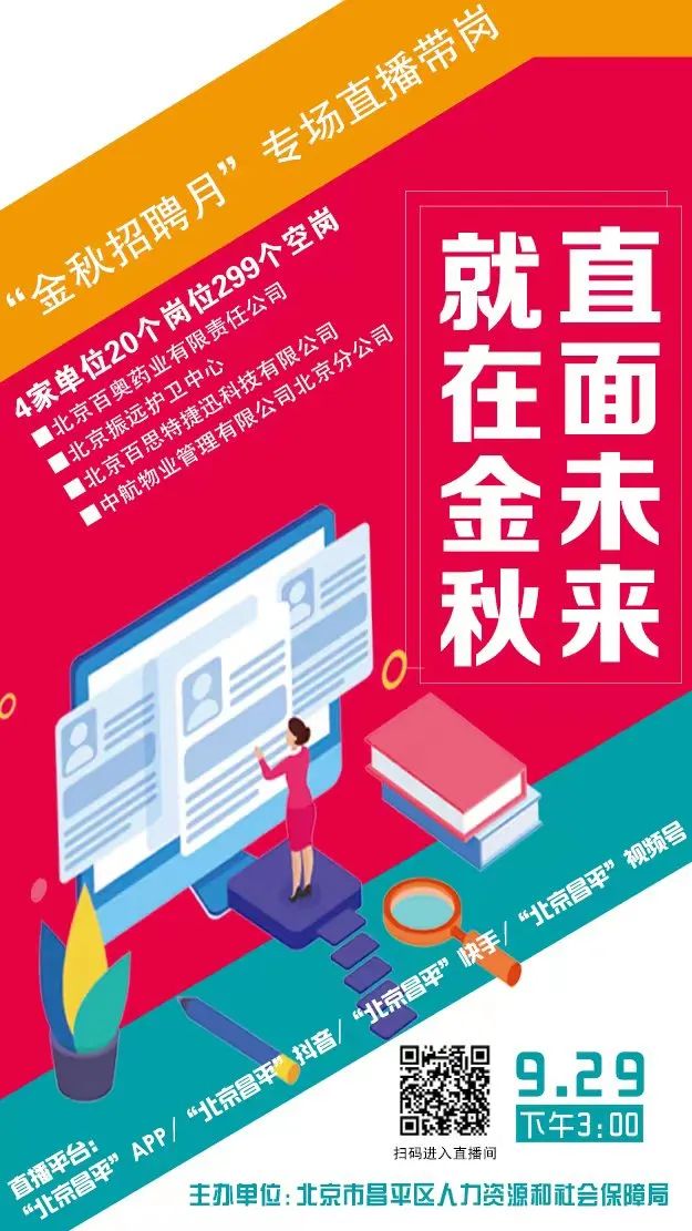 明天(9月29日)下午3:00,昌平区公服中心将举办以“就在金秋 直面未来”为主题的“金秋招聘月”专场直播带岗活动。