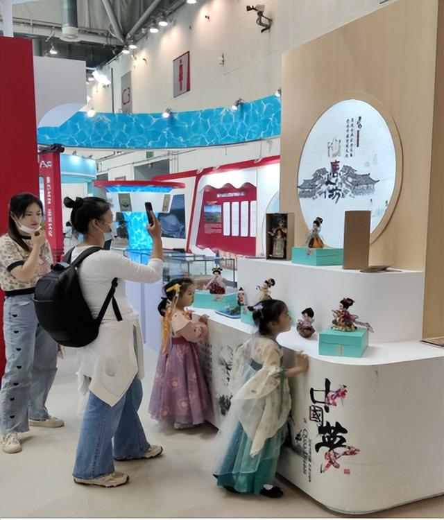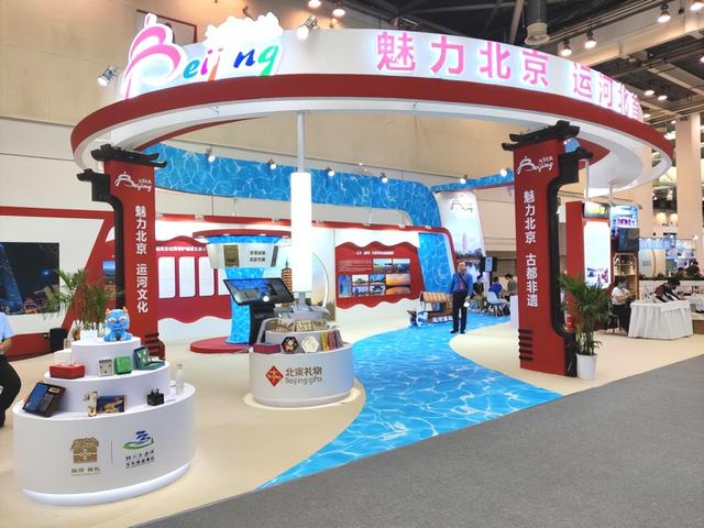 北京展区以象征运河的“蓝”与代表古都的“红”为基色,雍容古典中洋溢着清新雅致。展区以“北京(通州)大运河文化旅游景区创建国家5A级旅游景区”为主要展示内容,将2014年大运河申遗成功以来,北京大运河文化带建设的重要成果加以展示,并将北京(通州)大运河文化旅游景区内建设现状、功能分区及智慧旅游、文创产品开发等内容集中展现;展区的另一部分,则凸显古都北京的历史风韵,集中展示内联升、金漆镶嵌、唐人坊等非遗传统手工技艺,整个展区将运河文化与古都非遗的内容有机融合,将一个极具文化底蕴与创新智慧的城市形象展示在观众面前。