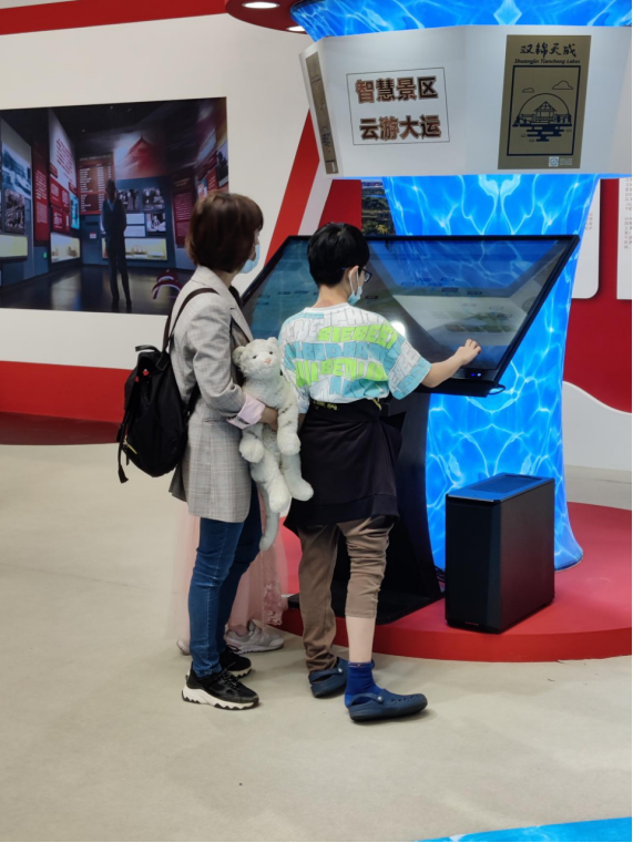 展区除两大主题线划分外,亦将展示内容进行相应的功能划分。他们分别是以北京(通州)大运河文化旅游景区争创国家5A旅游景区为主要内容的文化宣传区、以景区智慧导览交互为内容的观众互动区、文创商品展示区、非遗手工展示区及文旅咨询洽谈区。展区内的led大屏滚动播放北京城市宣传片、北京(通州)大运河景区宣传片以及内联升、金漆镶嵌、唐人坊等企业的宣传视频,营造出震撼、时尚、多元的现场氛围。展区内重点推出了近三年备受游客青睐的、独具京味的特色旅游商品,诸如文创商品、非遗展品等。现场发放的各类主题旅游宣传册、画册、纪念品等均受到与会观众的青睐和好评。