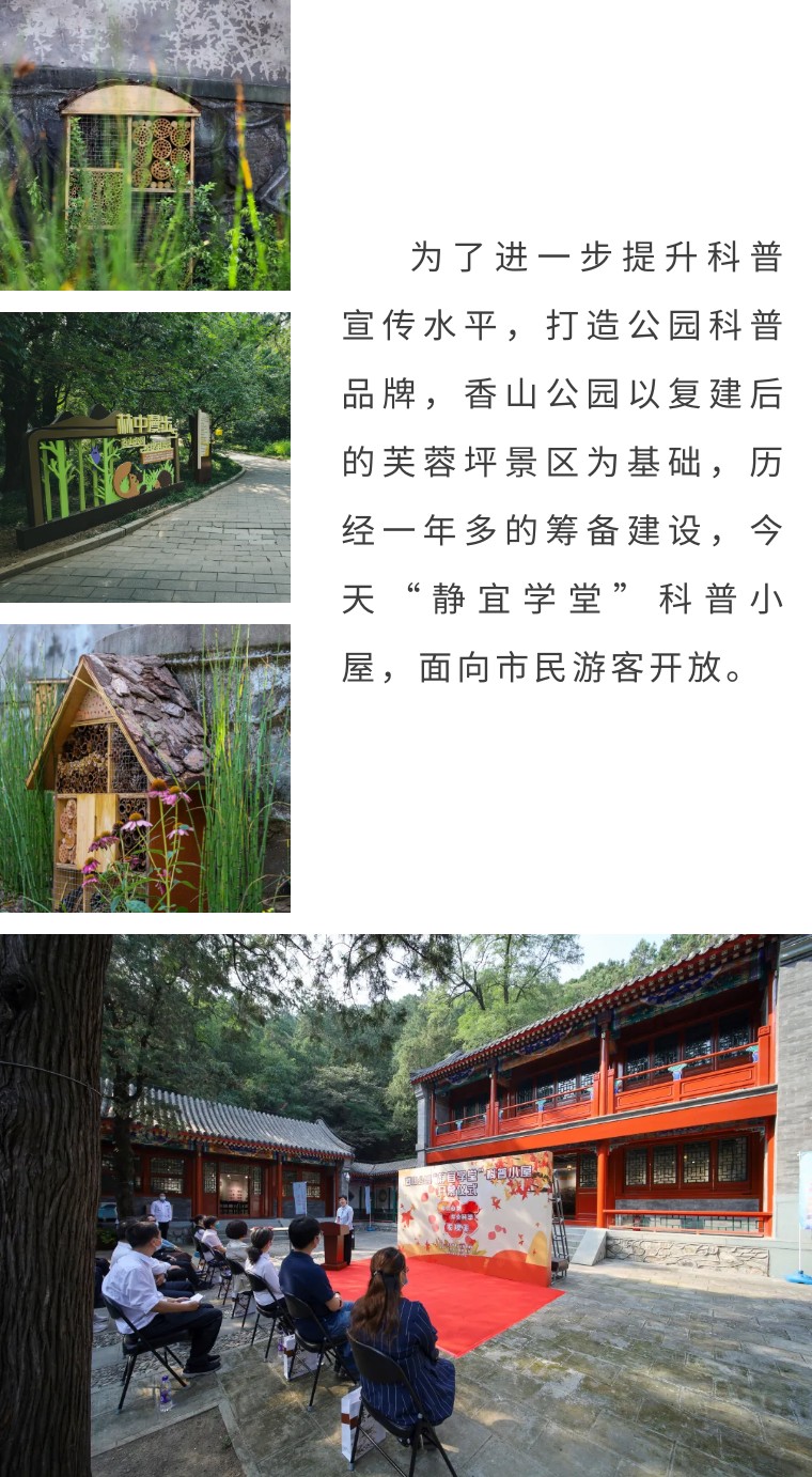 2021年香山公园被评为北京市园林绿化科普基地;2022年被评为首都生态文明宣传教育基地。此次,“静宜学堂”科普小屋的开放又将为公园增添一处科普阵地,为市民游客带来更多认知自然、了解自然的科普体验。