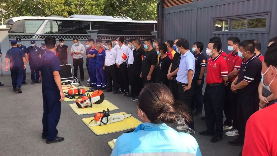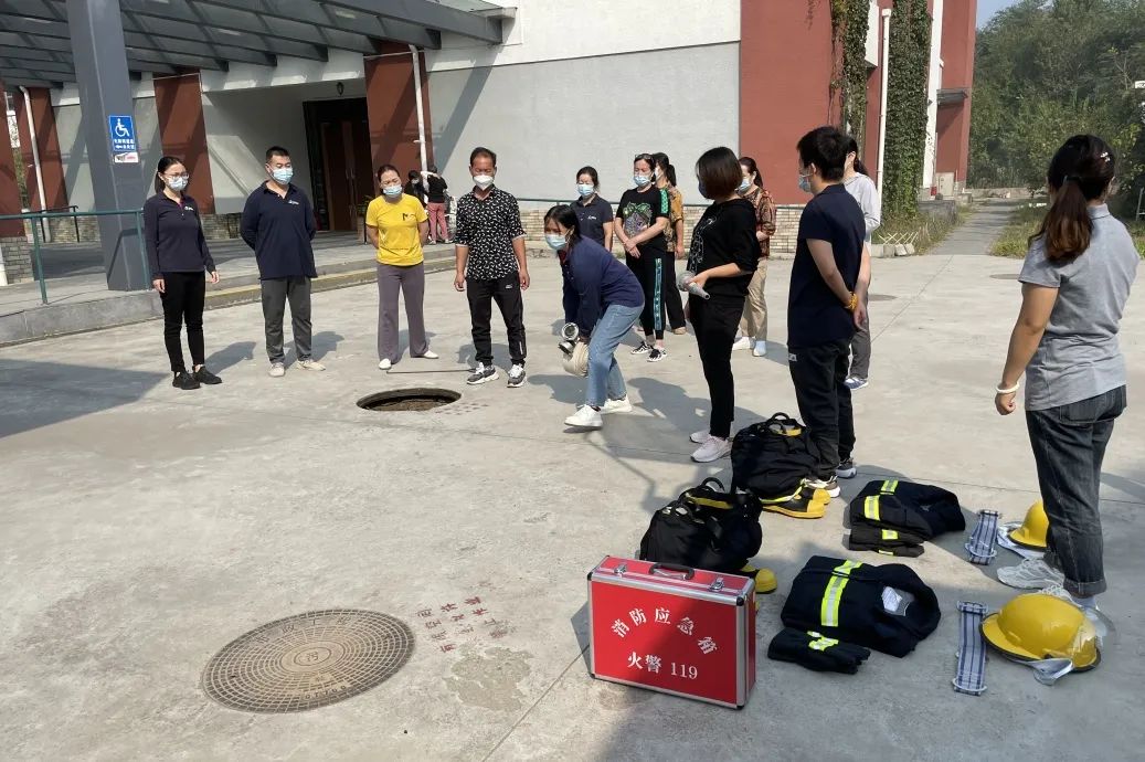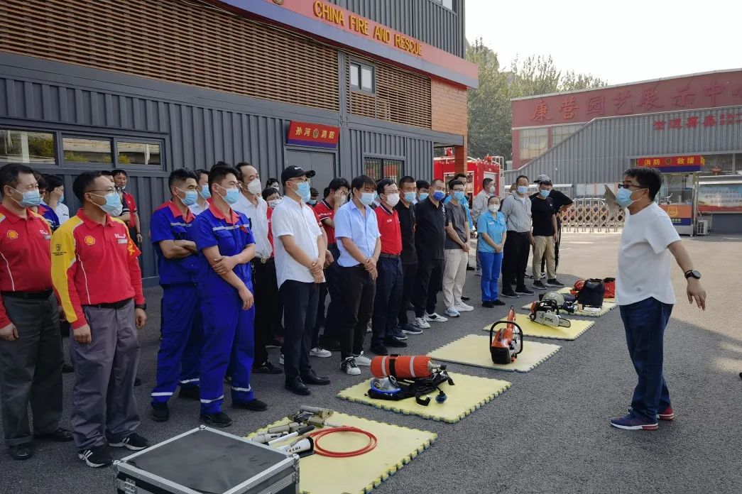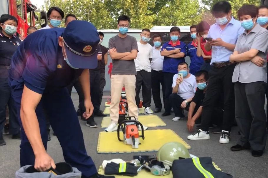演练过程中,消防员进行了消防救援器材演示,详细讲解和示范灭火器等常规消防器材的检查方法及消防水带、呼吸器等的使用方法,并带领参训人员进行实操演练。