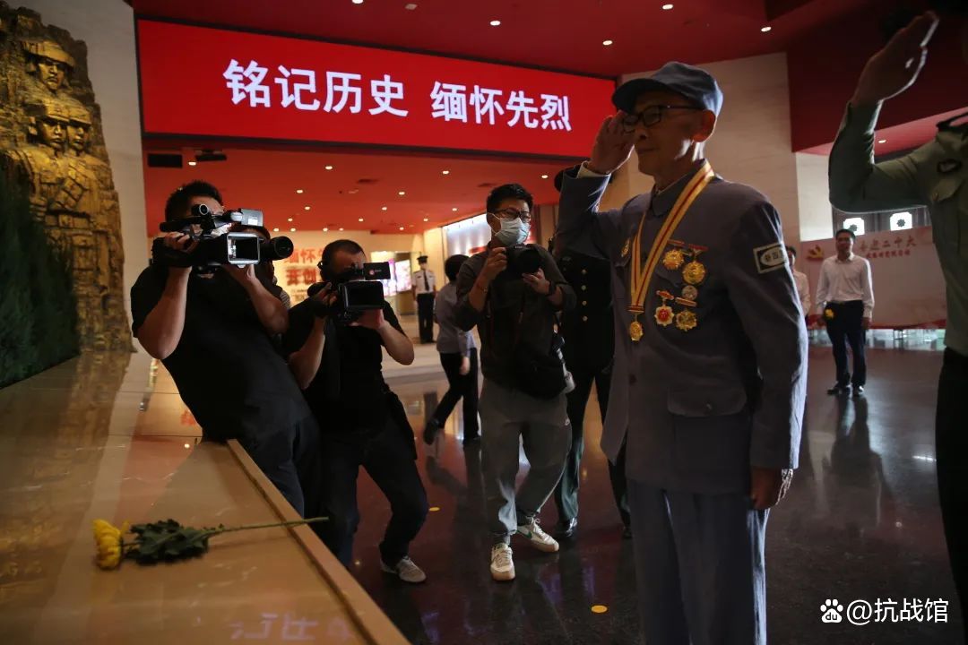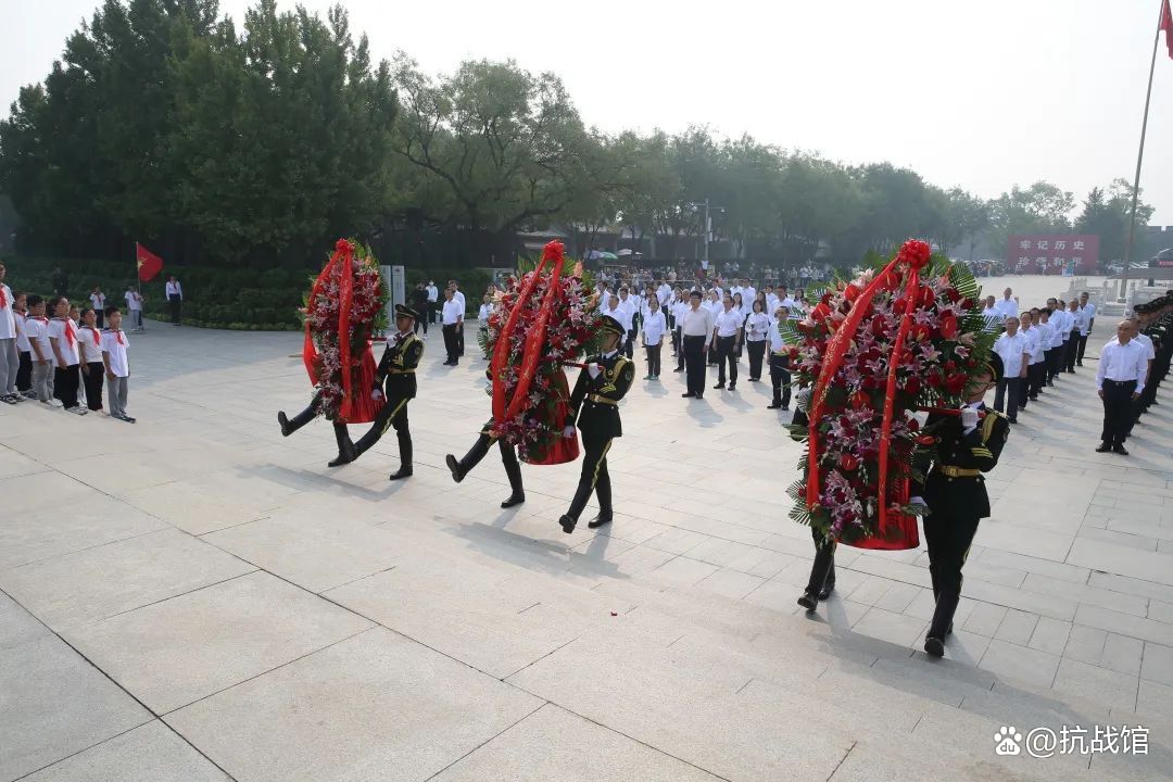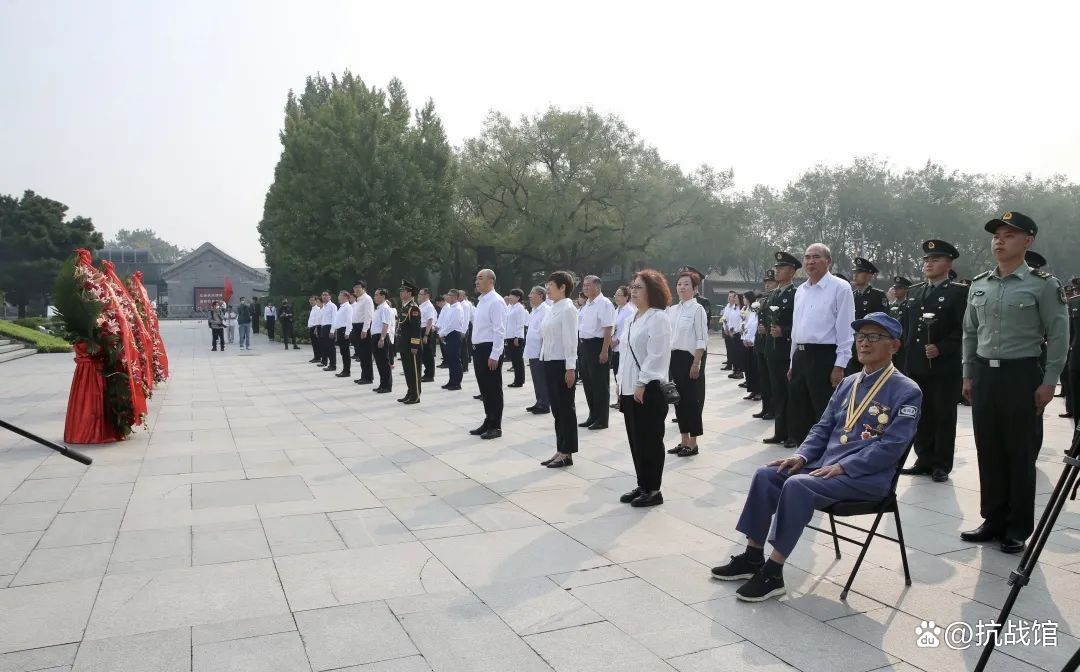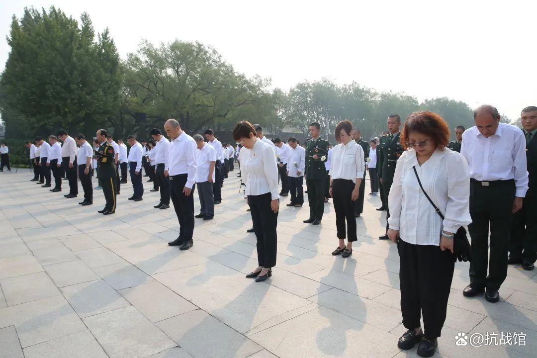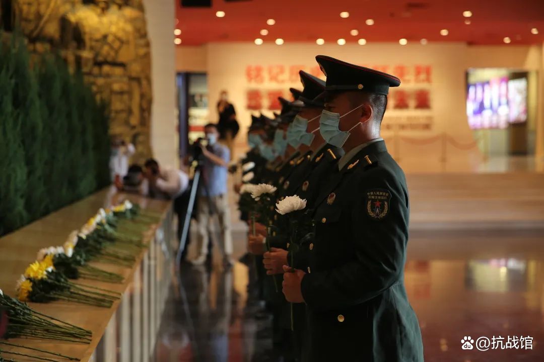 全体人员面向序厅铜墙铁壁,向在中国人民抗日战争中英勇牺牲的烈士默哀,向革命先烈致以崇高的敬意与深切的缅怀。