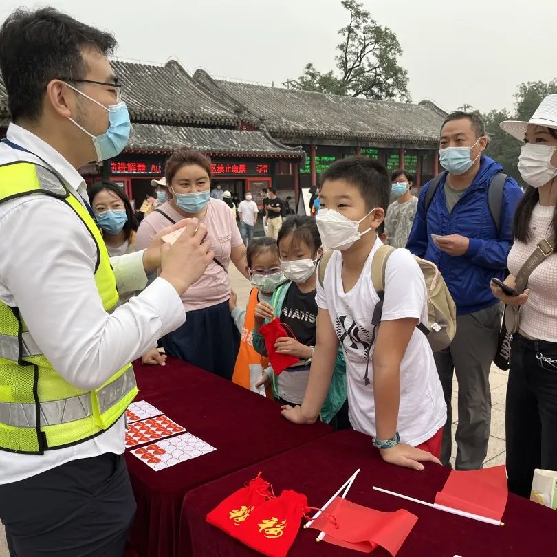 游客积极参与爱国答题,答对题目的游客可以参与抽取福袋活动。福袋里放置了颐和园文创文具产品,希望游客用画笔书写自己的幸福人生,抒发自己的爱国、爱党情怀。