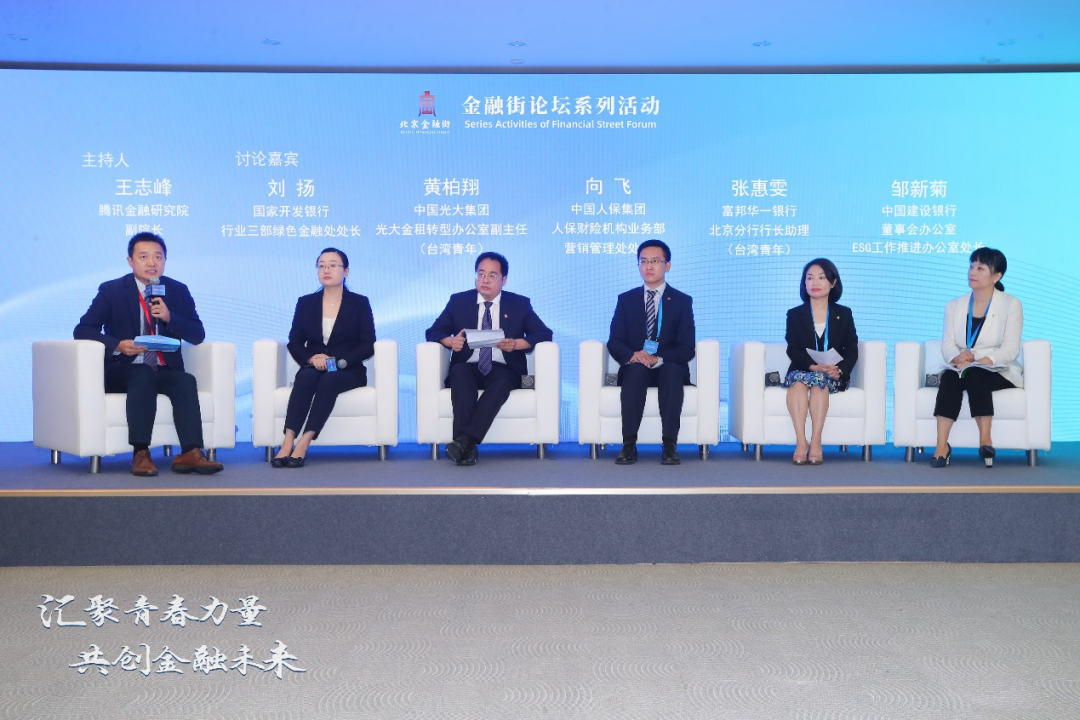 圆桌交流环节,由腾讯金融研究院副院长王志峰主持,国家开发银行行业三部绿色金融处处长刘扬,台湾青年、中国光大集团光大金租转型办公室副主任黄柏翔,中国人保集团人保财险机构业务部营销管理处处长向飞,台湾青年、富邦华一银行北京分行行长助理张惠雯,中国建设银行董事会办公室ESG工作推进办公室处长邹新菊从如何正确认识和把握碳达峰、碳中和,坚持系统观念,尊重经济和产业发展规律,持续推动绿色金融改革和创新,为经济高质量发展和碳达峰、碳中和目标稳步实现贡献力量等进行深入探讨。