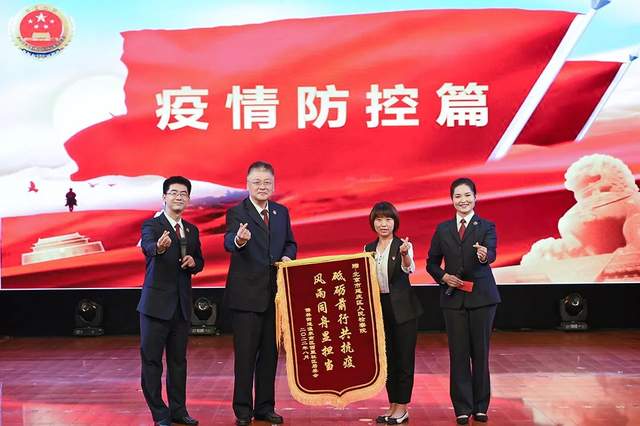 下沉社区支援抗疫的温泉西里居委会主任于敏向延庆区检察院赠送锦旗并表示:非常感谢咱们检察院对我们居委会工作的大力支持,面对抗疫压力,检察院第一时间伸出援手。听了刚才的宣讲,觉得你们讲得特别地好,特别是检察官对延庆老百姓的那份热心,令人动容。