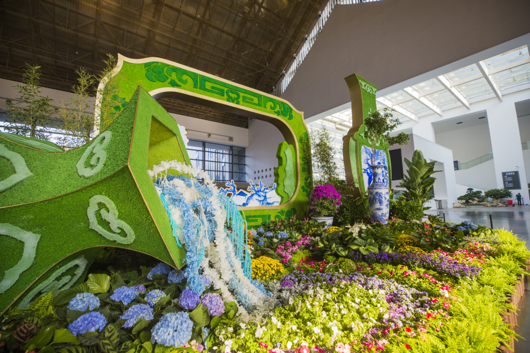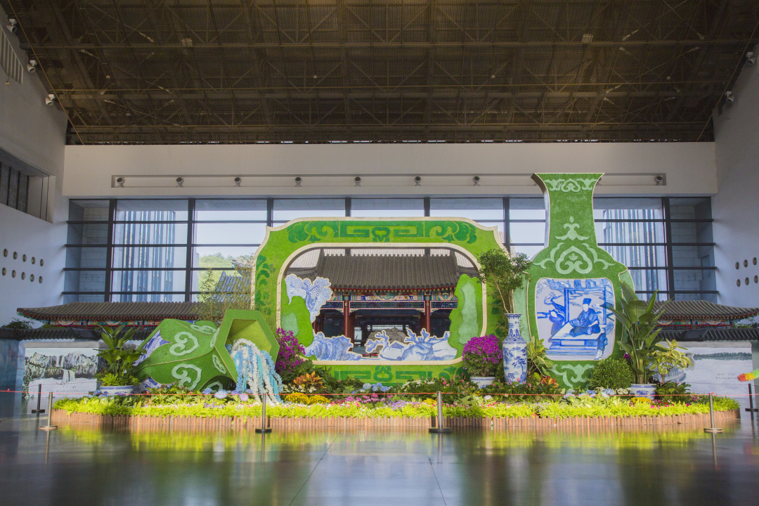 花坛的设计创意,来源于青花瓷上的瓷画,将中式传统瓷器样式:古代人物画、山水风景、传统花草纹饰都呈现在其中,代表着组成中国古典园林的三种元素:人文精神为神、山水风光为骨,树木花草为皮。花坛以三个精美的青花瓷器为载体,展现了中国的园林风貌和中国人文典故。