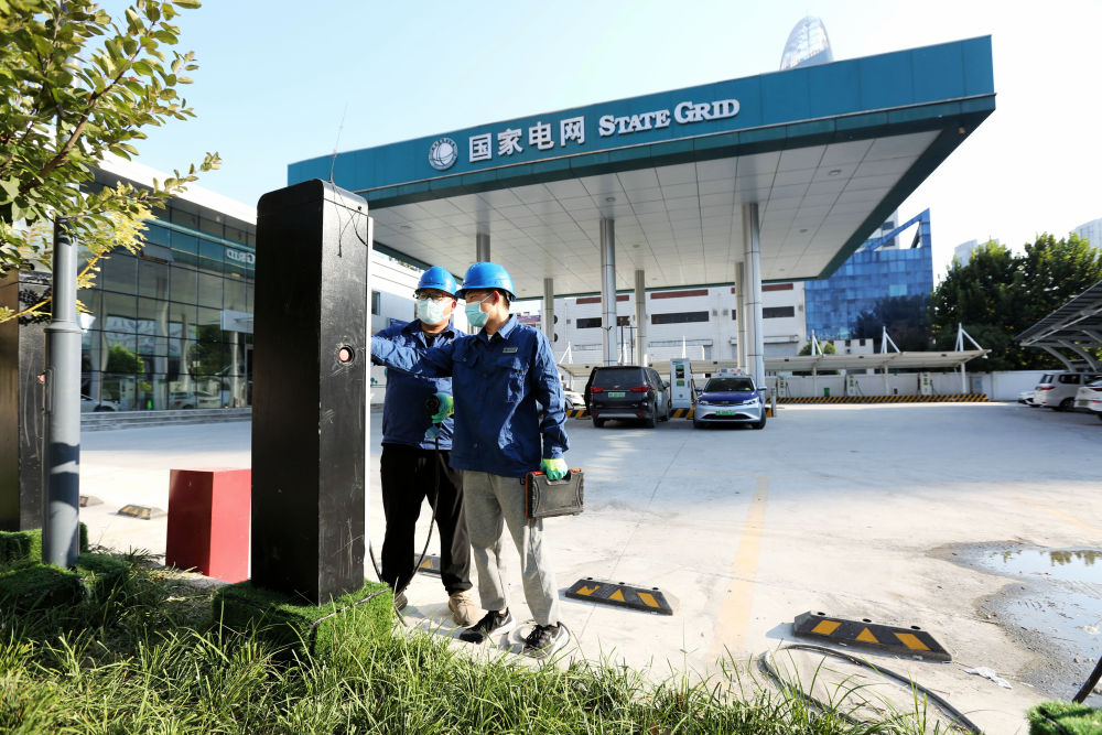 在济南一处电动汽车充电站,工作人员对充电设施进行巡视检查。(受访者供图)