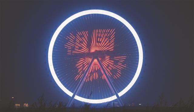 国庆节期间,哈尔滨冰雪大世界摩天轮正式点亮。当夜幕降下,摩天轮开始闪烁多彩的光华,变幻出“国庆快乐”“祖国您好”等字幕。