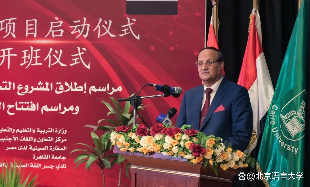 近日,埃及中学中文教育试点项目启动仪式暨中文教师培训班开班仪式在开罗大学举行。埃及教育与技术教育部副部长穆罕默德·穆贾希德、中外语言交流合作中心主任马箭飞、中国驻埃及大使馆临时代办张涛、北京语言大学校长刘利、开罗大学副校长贾麦乐·沙希里发表致辞。