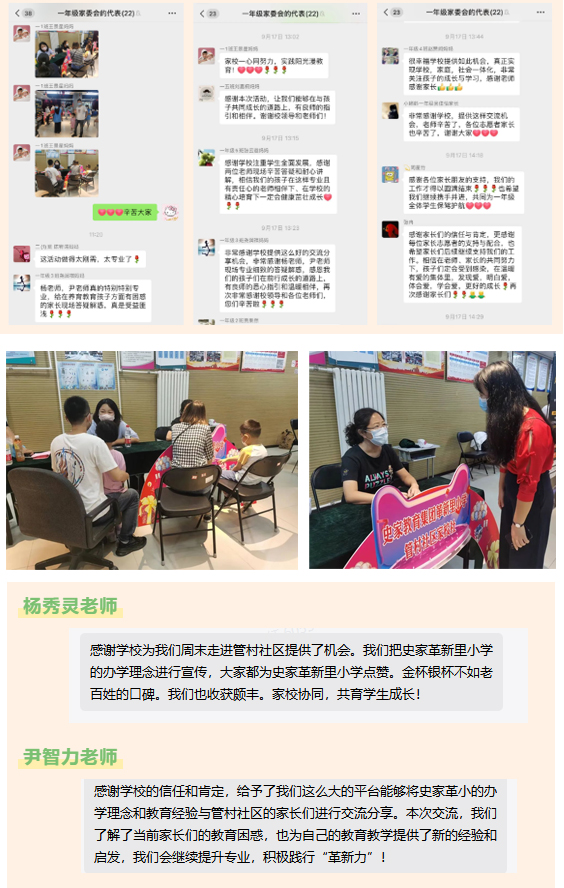 我校的“家校社”协同教育,一直以来广泛受到社会赞誉,2022年9月17日,班主任团队代表:骨干班主任杨秀灵老师,优秀青年班主任尹智力老师走进“管村社区”,为社区家长朋友提供了专业、有深度的家庭启蒙教育咨询。