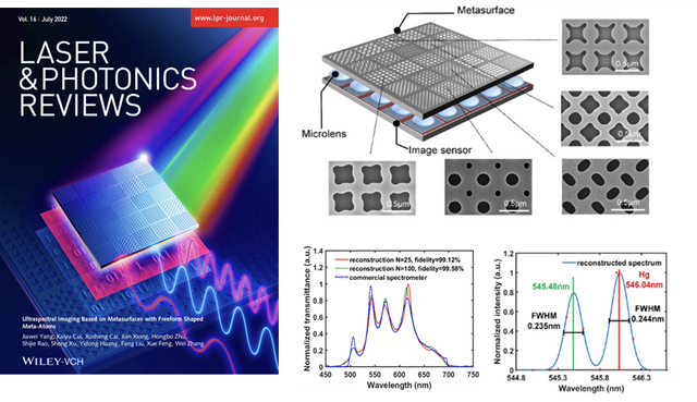 团队成员通过硅基超表面实现对入射光的频谱域调制,利用CMOS图像传感器完成频谱域到电域的投影测量,再采用压缩感知算法进行光谱重建,并进一步通过超表面的大规模阵列集成实现实时光谱成像。期刊《科学》(Science)综述论文“光谱仪的小型化”(“Miniaturization of Optical Spectrometers”)将这一超光谱成像芯片技术列为该领域最新的研究成果。团队进一步提出了一种自由形状超原子(Freeform shaped meta-atoms)的超表面设计方法,将微纳光电子与光谱技术深度交叉融合。成果连续在光子领域著名期刊《光学》(Optica)和《激光与光子学评论》( Laser & Photonics Reviews )上发表文章。