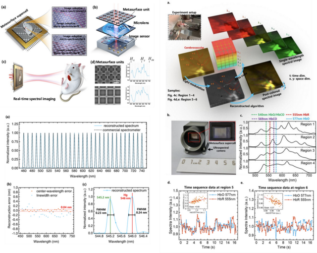 面向人民生命健康,是崔开宇和同学们非常期待的努力方向。研究团队与清华大学生物医学工程系洪波教授团队合作,基于该实时超光谱成像芯片首次测量了活体大鼠脑部血红蛋白及其衍生物的特征光谱的动态变化,获取了大鼠脑部不同位置的动态光谱变化情况,结合血红蛋白的特征吸收峰,分析获取对应血管区和非血管区血红蛋白含量的变化情况,并可利用神经血氧耦合的机制得出脑部神经元的活跃状态。