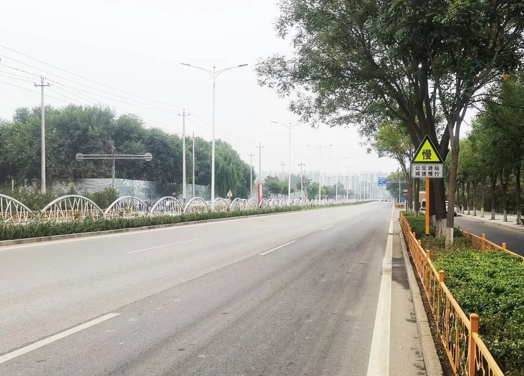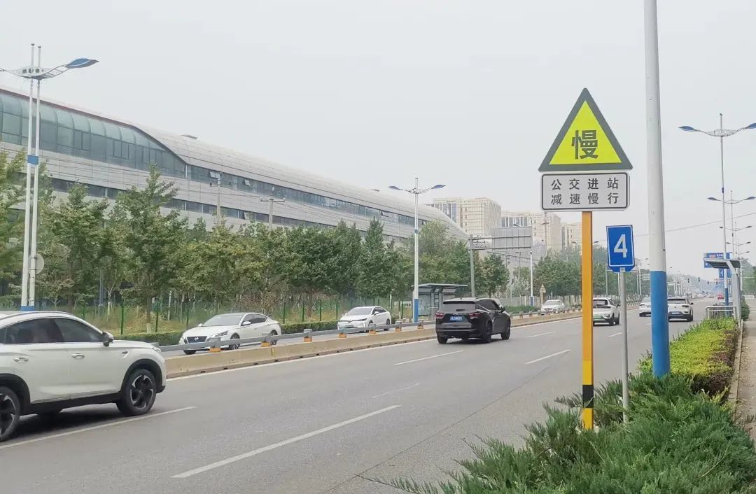 顺平路国航飞训基地公交站前增设“公交进站,减速慢行”提示牌。