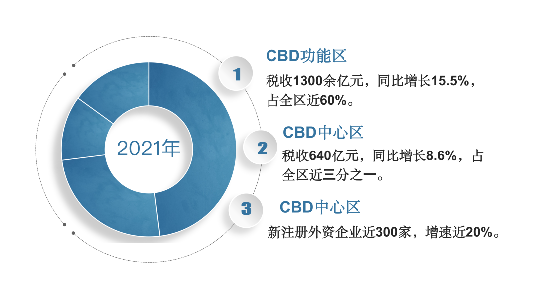 2021年,CBD功能区税收实现1300余亿元,同比增长15.5%,占朝阳区近60%;CBD中心区税收实现640亿元,同比增长8.6%,占朝阳区近三分之一;新注册外资企业近300家,增速近20%。