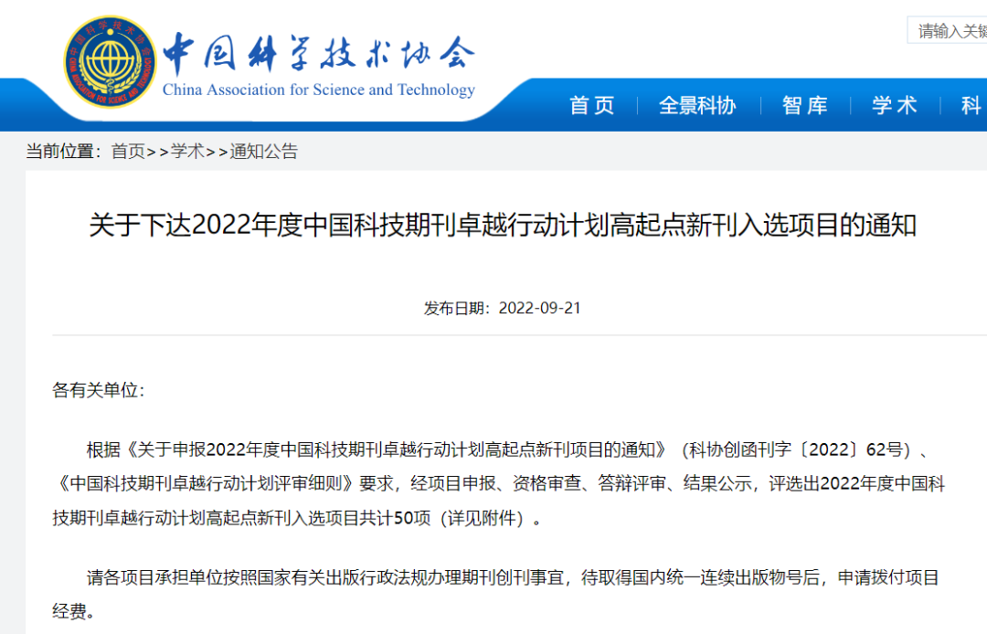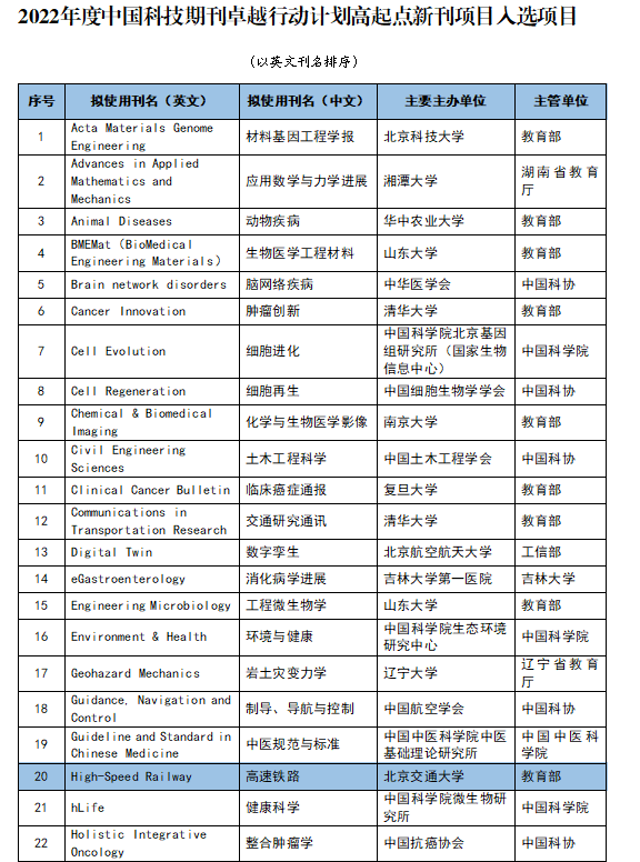 2022年9月21日,中国科技期刊卓越行动计划办公室发布了《关于下达2022年度中国科技期刊卓越行动计划高起点新刊入选项目的通知》。经过项目申报、资格审查、评审和结果公示,我校主办的《高速铁路》(High-Speed Railway),成功入选“2022年度中国科技期刊卓越行动计划高起点新刊”项目。