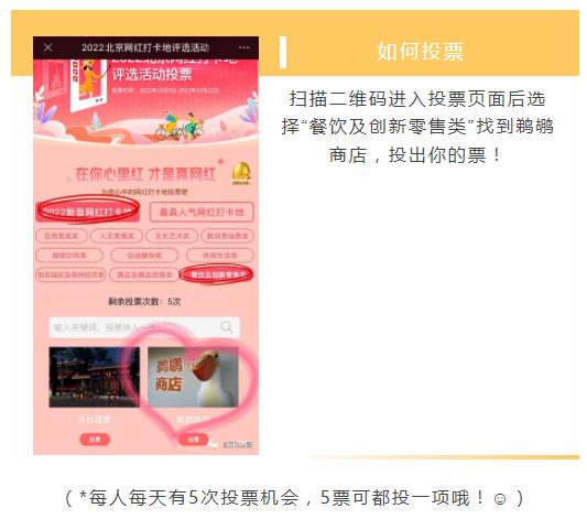 “2022北京网红打卡地”评选活动的投票环节时间为10月9日至10月22日。网友可以通过美团APP、文旅北京微信公众号参与活动,为你心中真正的网红打卡地投票。投票结果将与专家评审意见结合,于11月揭晓最终上榜的100个新晋网红打卡地。