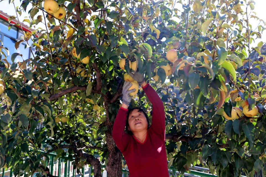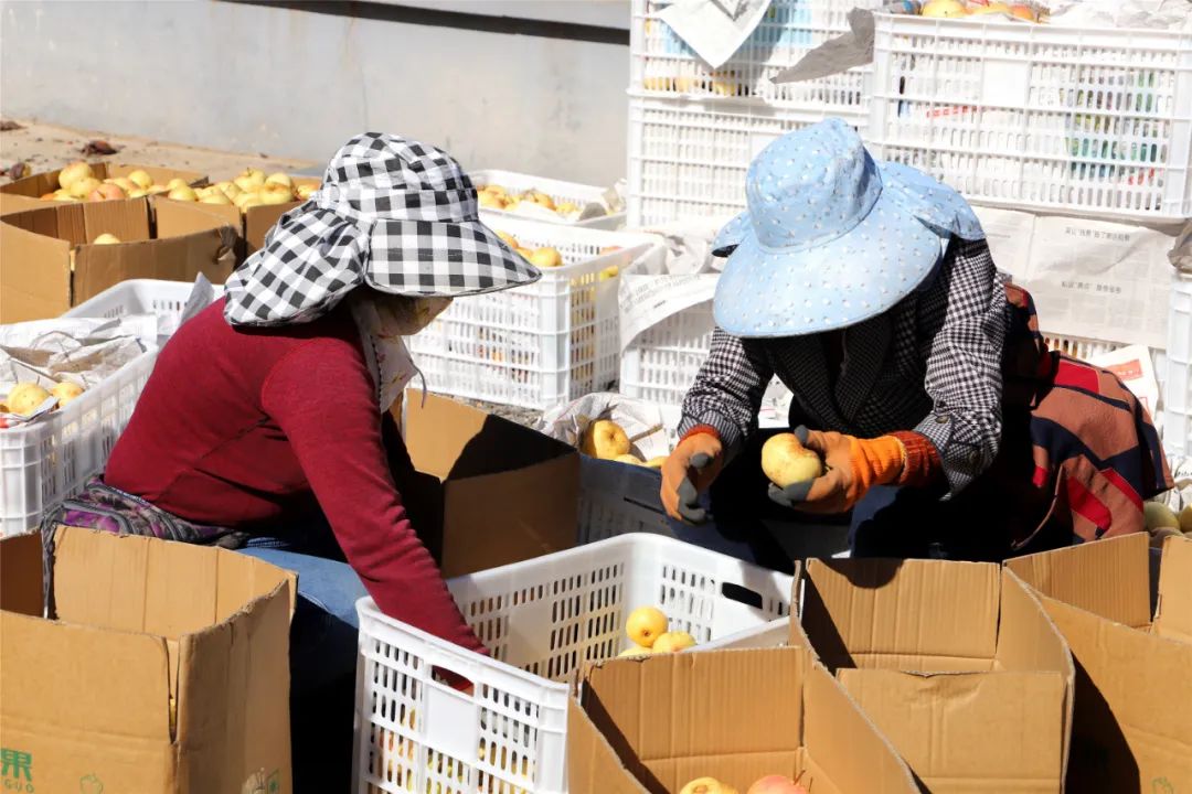 沉甸甸的苹果梨挂满枝头,走进果园,阵阵果香扑鼻而来。梨树上,一个个圆润饱满的苹果梨挂满枝头,村民们正忙着采摘、分装。