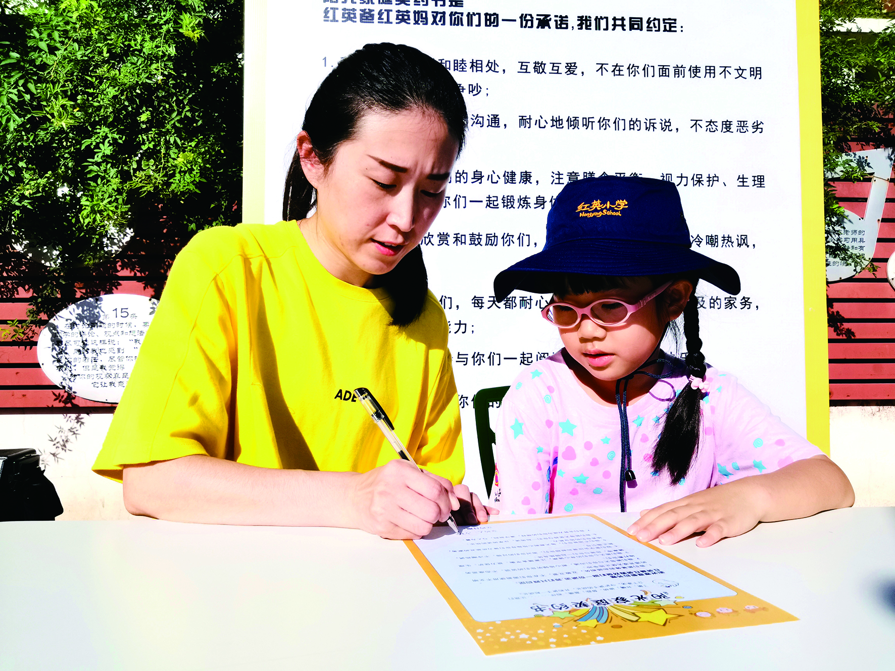 一所优秀的学校可以改变学生家庭的“家风”。在红英小学每一年新生入学,孩子和自己的爸爸妈妈共同签订“阳光家庭契约书”。比如,夫妻之间要做到和睦相处,互敬互爱,不在孩子面前使用不文明语言或无休止地争吵;每天与孩子沟通,耐心地倾听孩子的诉说,不态度恶劣地打断孩子;关心孩子的身心健康,关注膳食平衡,视力保护,生理健康等,经常与孩子一起锻炼身体;学会欣赏和鼓励孩子,面对孩子的过错,不冷嘲热讽,能正确引导;不溺爱孩子,每天都耐心指导孩子做力所能及的家务,培养孩子的独立能力;每天坚持与孩子一起阅读,分享彼此的阅读感受;努力成为孩子的榜样,遵守规则,与人为善。通过这样详细而全面的“契约书”,培养孩子正确的行为习惯,也帮助家庭养成了良好的亲子氛围。