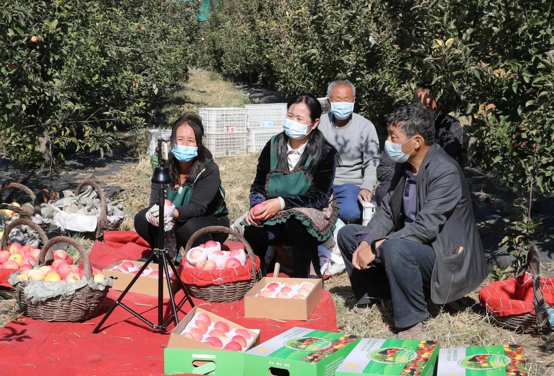 北京金旺果品产销专业合作社苹果园内,总经理王崇平组织员工通过手机收看党的二十大开幕会直播。