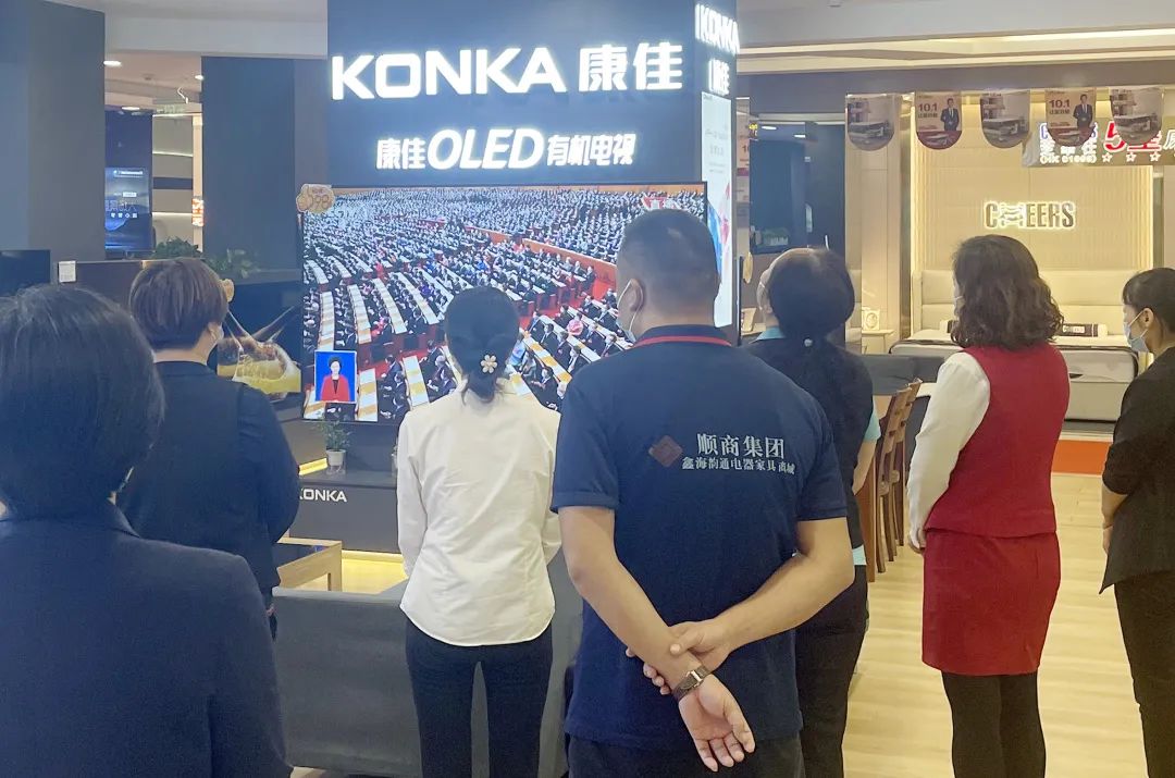 鑫海韵通电器家具商城内,顾客、员工观看党的二十大开幕会盛况。