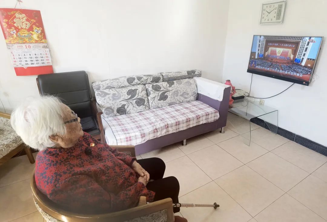 96岁高龄的老党员李伟收看党的二十大开幕会。