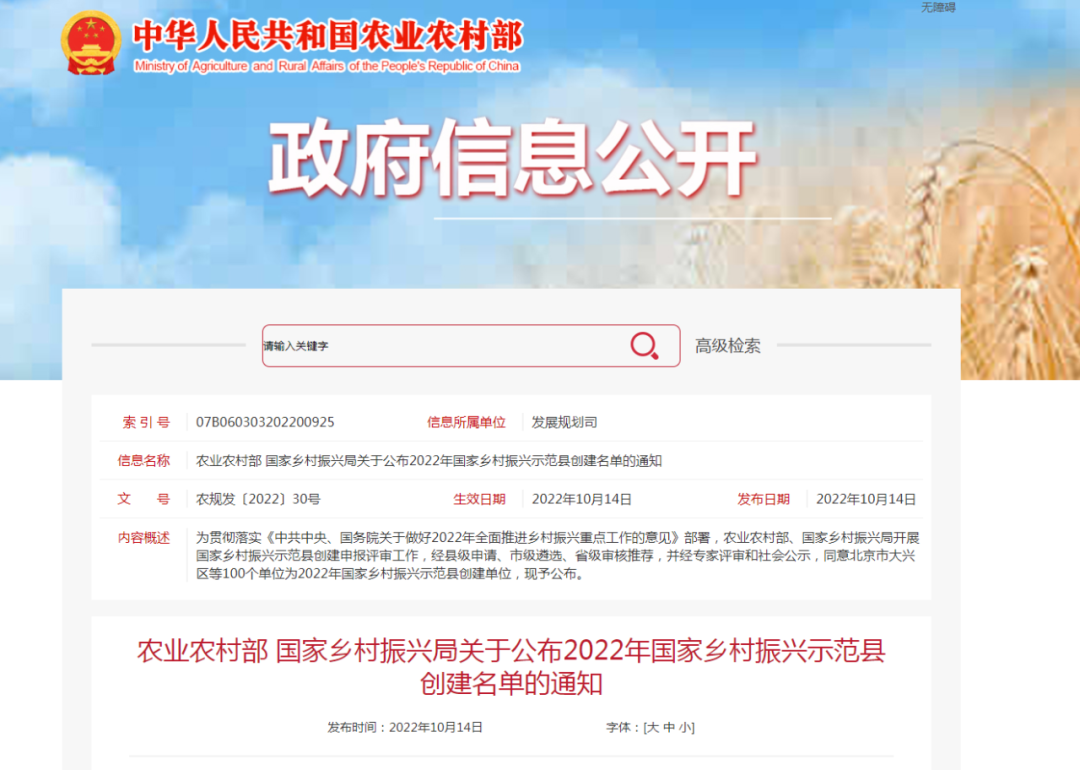 农业农村部、国家乡村振兴局开展的国家乡村振兴示范县创建申报评审工作近日完成,北京市大兴区、河南省兰考县、四川省眉山市东坡区等100个单位为2022年国家乡村振兴示范县。其中甘肃省会宁县、民勤县、临泽县三地上榜。