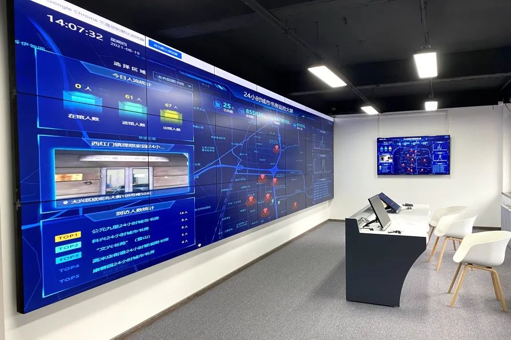 另一套则是“一屏收”智能安监系统。集成智能化安全监控平台、大数据数据分析平台两大模块。将运行情况、监控视频、服务数据等功能,利用可视化手段集中到中央监控中心大屏幕。进出馆人数、借阅情况、读者信息等数据实时显示,同时汇集所有监控视频进行实时分析、自动辨别、自动预警,使管理员第一时间获取异常状况提醒。虽然无人值守,但运行情况尽在掌握。