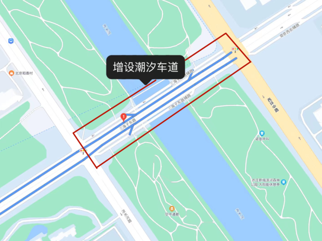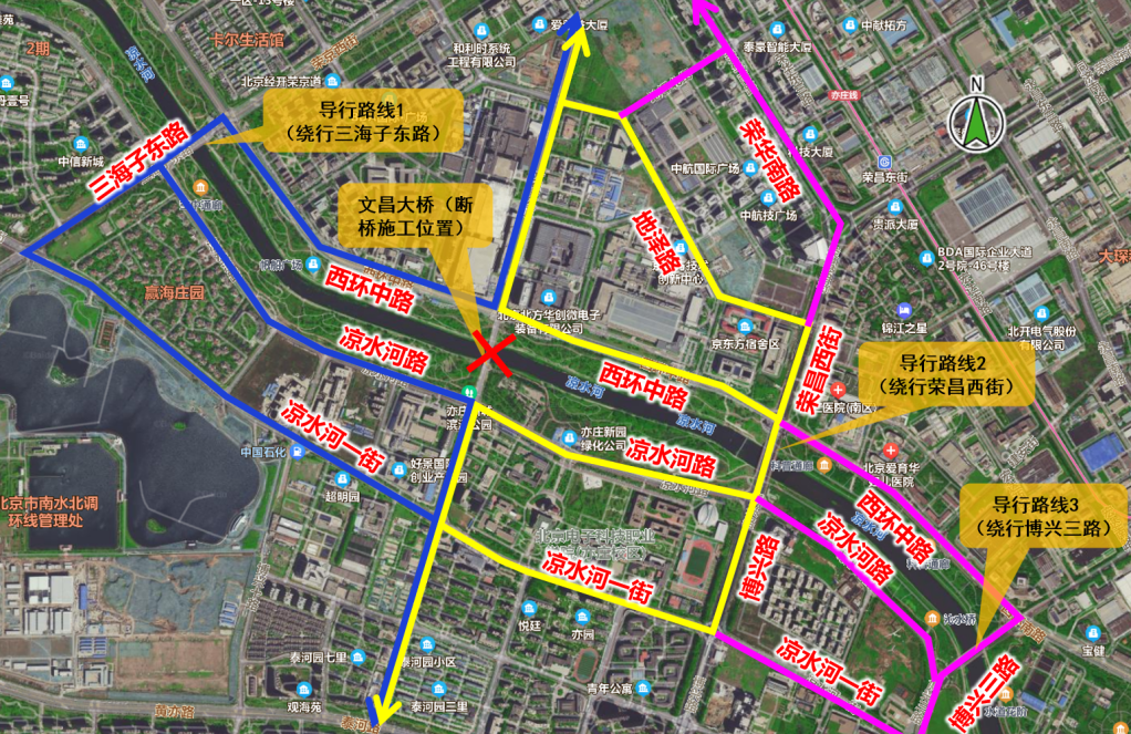 封闭期间,通过相邻三海子东路跨凉水河桥(南北向双向8车道,并同时开启潮汐车道)、荣昌西街跨凉水河桥(南北向双向8车道)、博兴三路跨凉水河桥(南北向双向6车道,并同时开启潮汐车道)通行。