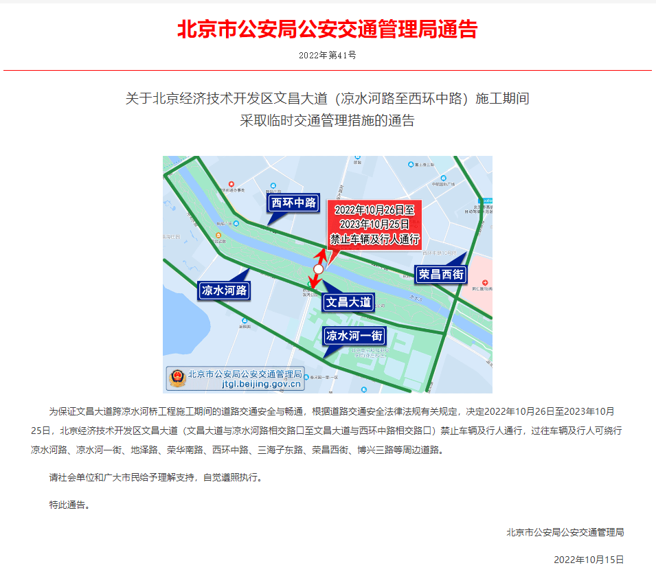 为保证文昌大道跨凉水河桥工程施工期间的道路交通安全与畅通,根据道路交通安全法律法规有关规定,决定2022年10月26日至2023年10月25日,北京经开区文昌大道(文昌大道与凉水河路相交路口至文昌大道与西环中路相交路口)禁止车辆及行人通行,过往车辆及行人可绕行凉水河路、凉水河一街、地泽路、荣华南路、西环中路、三海子东路、荣昌西街、博兴三路等周边道路。