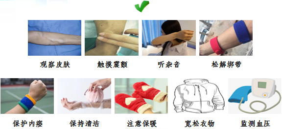 密切观察内瘘皮肤情况、触摸内瘘震颤、倾听内瘘杂音,注意正确的绑带松解方法、保持内瘘的清洁、保护内瘘、注意保暖、穿宽松衣物,密切监测血压。