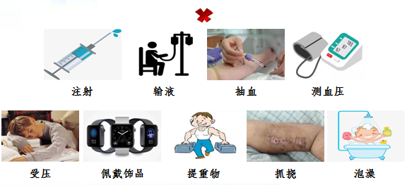 非紧急情况不要在内瘘侧手臂注射、输液、抽血、测量血压,避免内瘘侧手臂受压、佩戴饰品、提重物、过度抓痒,严禁泡澡。