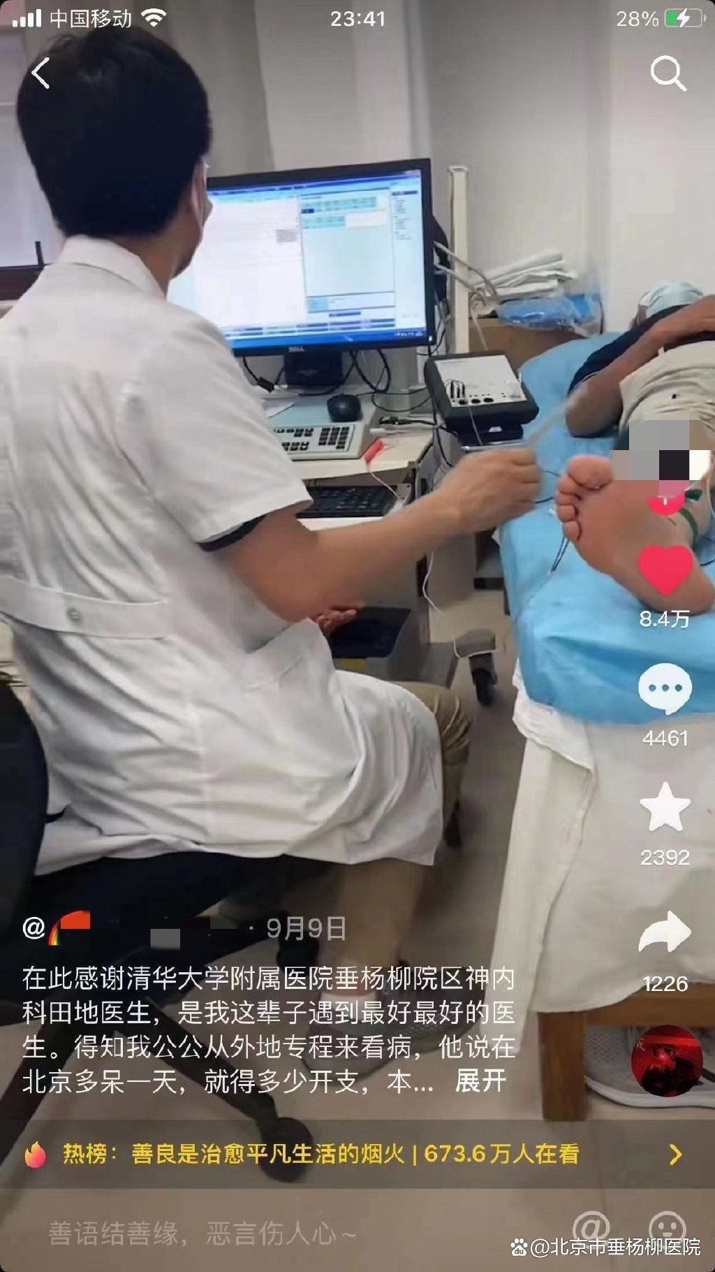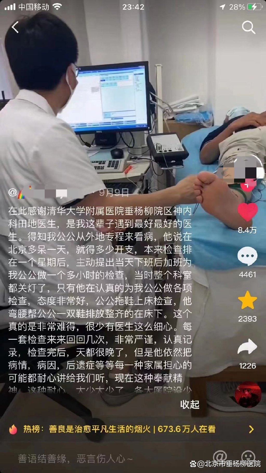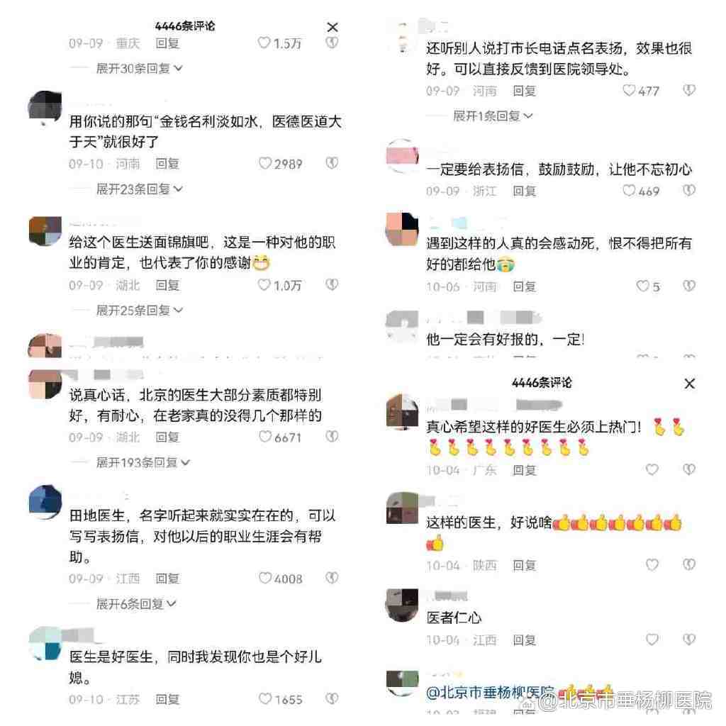 9月10日早晨,田地收到了同事的截屏,是一个点赞量超过2万多的视频,没过几天这份抖音点赞量就超过8.6万,评论量超过了4400条,许多人还特意@北京市垂杨柳医院,让田地这个不玩抖音的年轻医生意外引起很多人的关注和认可。