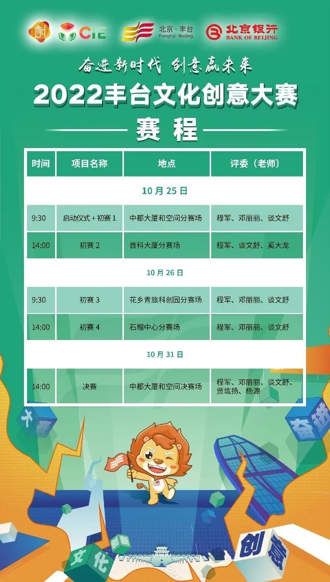 2022丰台文化创意大赛由北京市国有文化资产管理中心、北京市文化产业促进中心、丰台区委宣传部指导,丰台区文化创意产业促进中心主办,北京银行丰台支行特别支持。
