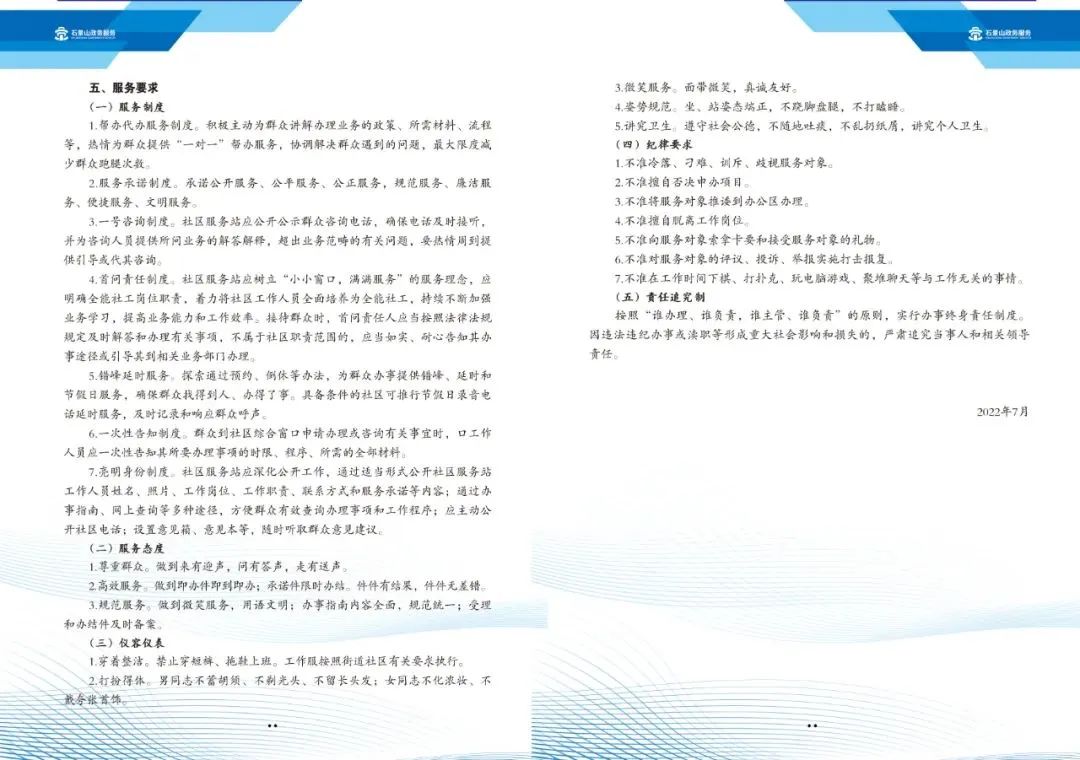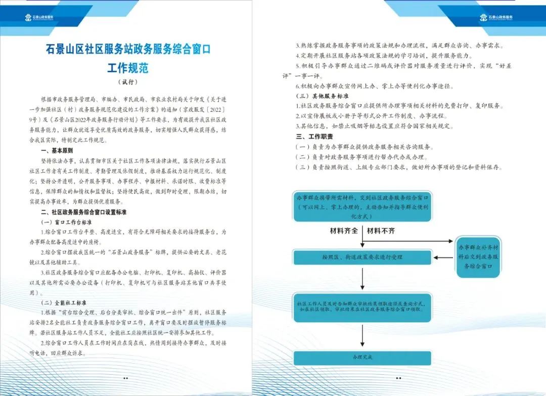 印制《石景山区政务服务规范化建设手册》,汇编各类事项办事指南,形成社区业务培训、宣传的石景山特色。