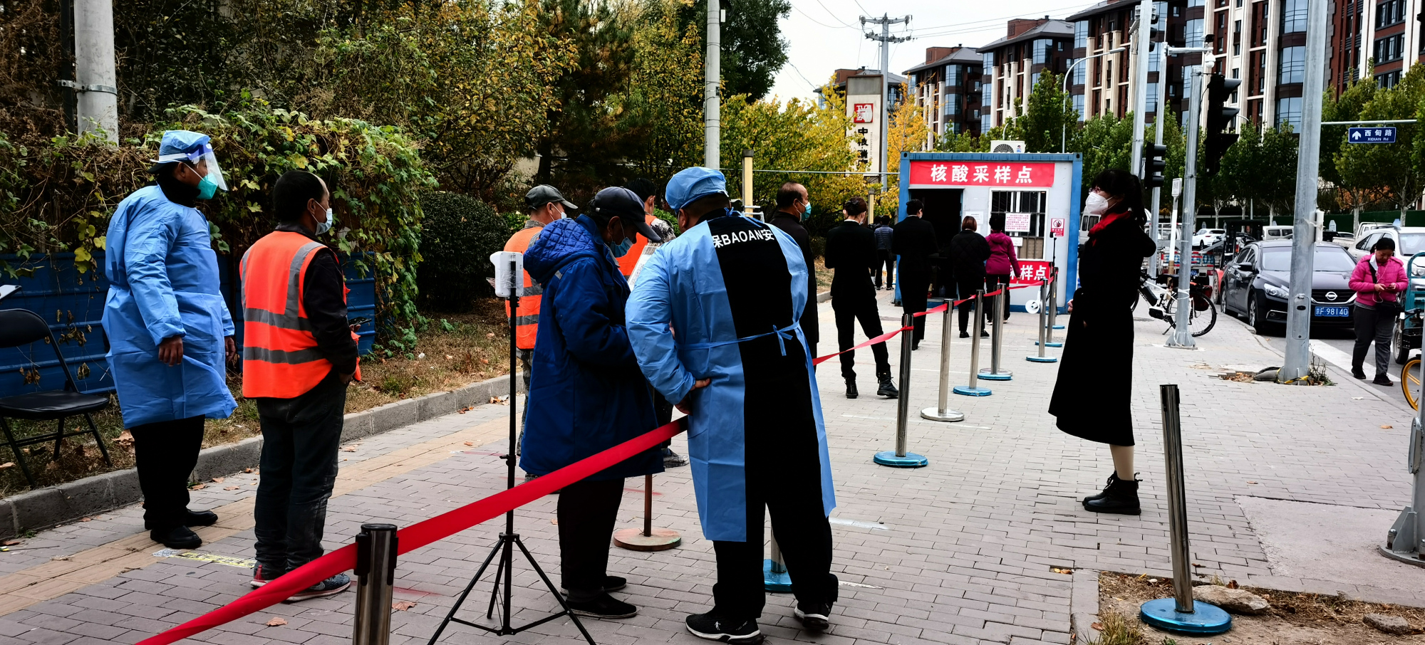 △各个核酸检测点,居民有序排队进行核酸检测。