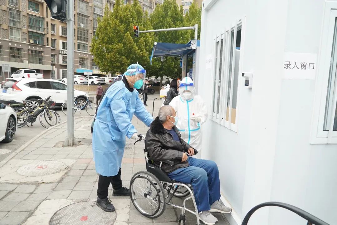 △康营家园17区核酸检测点,工作人员陪护高龄老人走“绿色通道”完成核酸检测。