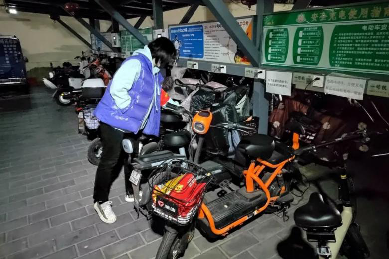 工作人员对辖区内电动自行车停放情况进行安全检查。