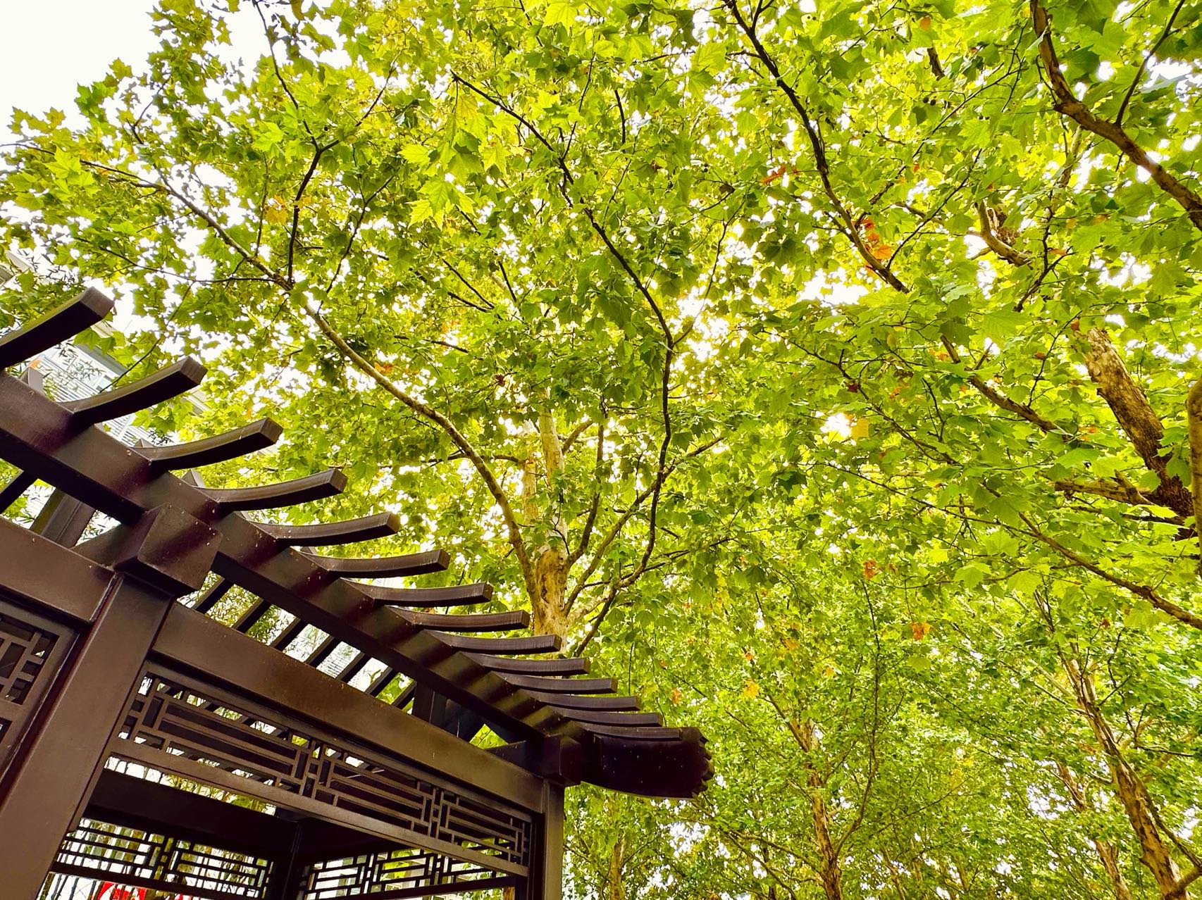 公园建设延续首都古都风貌,保留高大乔木、增设亭廊、栽植乡土植物,营造出青砖灰瓦、曲径幽廊、树影婆娑、鸟叫蝉鸣的园林意境。
