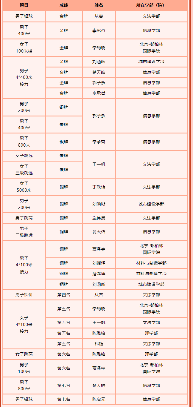 在中距离项目与长距离项目中,2019级本科生丁欣怡、2020级本科生李承哲分别获得女子5000米铜牌和男子800米银牌。