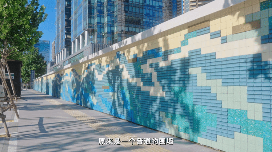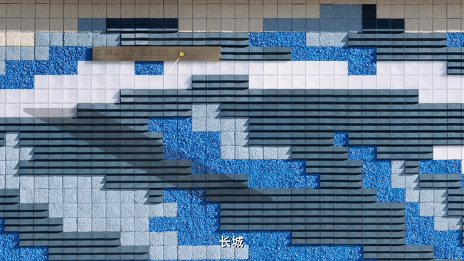 它也是一面展现我国“双碳”理念的环保墙。作品以近3万块废旧塑料瓶、高速公路反光牌、家电回收的外壳制作的再生环保砖为材料。塑料模块砖可重新利用,形成匹配新界面的新视觉画面,体现可持续环保理念,为CBD这片北京绿色建筑最为集中的区域,再添一抹绿元素。