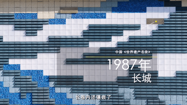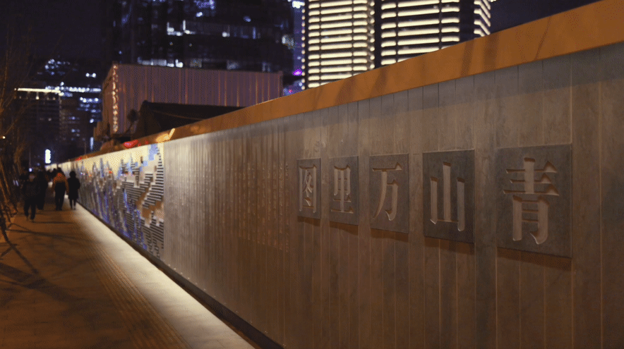 这幅青山万里图是整个CBD交通综改的收尾之作。这里原来是一个普通的围墙,地处CBD的核心区,位置相当的优越。经过艺术改造,于百米长卷中镶嵌中国现有56处世界遗产“金名片”。