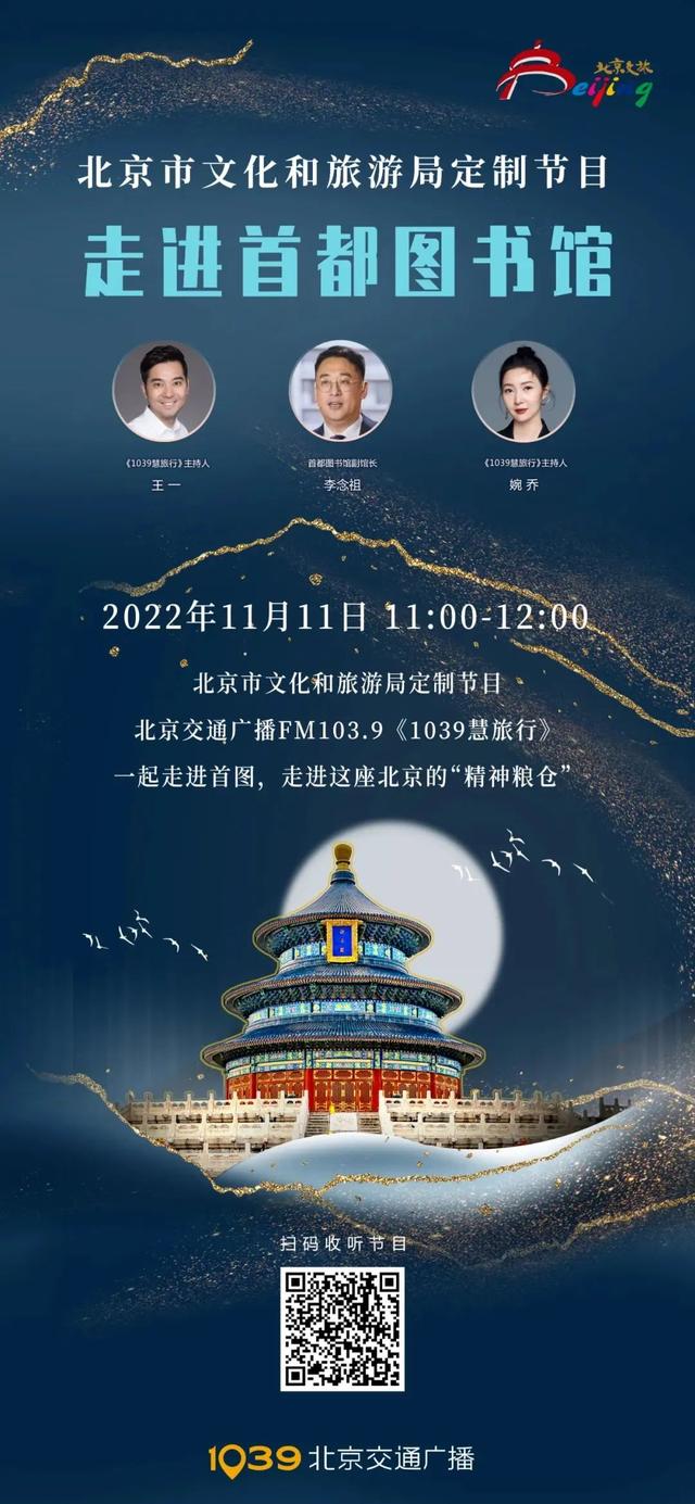 明天(11日)中午,北京交通广播《1039慧旅行》【北京市文化和旅游局定制节目】走进首都图书馆,特邀首都图书馆副馆长李念祖,带您一起走进首图,走进这座北京的“精神粮仓”。
