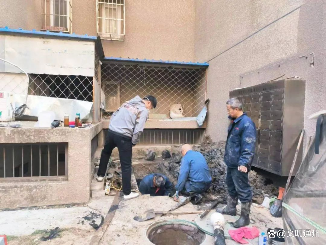 为尽快恢复地面平整、消除安全隐患,京贸家园社区督促物业公司及时制定抢修方案,并于当日下午立即组织维修人员开展污水管道紧急抢修作业。